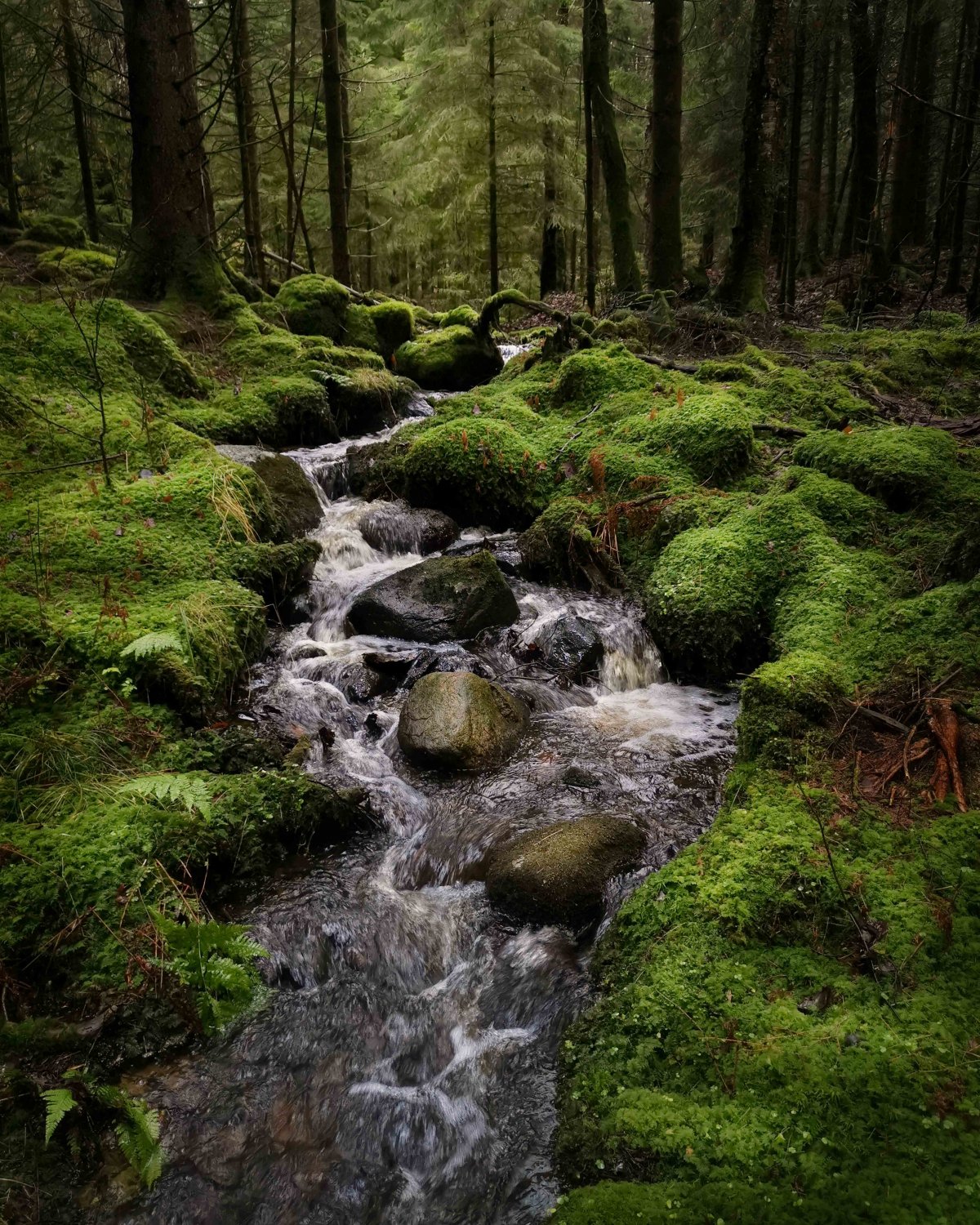 För att pudeln och jag inte ska "slita ut" våra rundor letar jag då och då efter nya. Den här bilden kommer från en sådan runda i Svartedalen, då jag hittade denna lilla bäck. Älskar bäcken som rinner genom mossan och ljuset som kommer in där längre in i skogen.